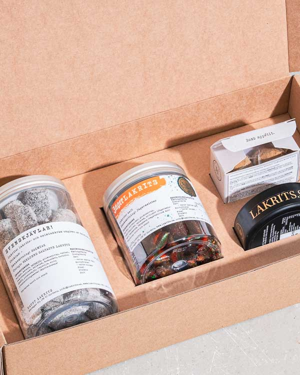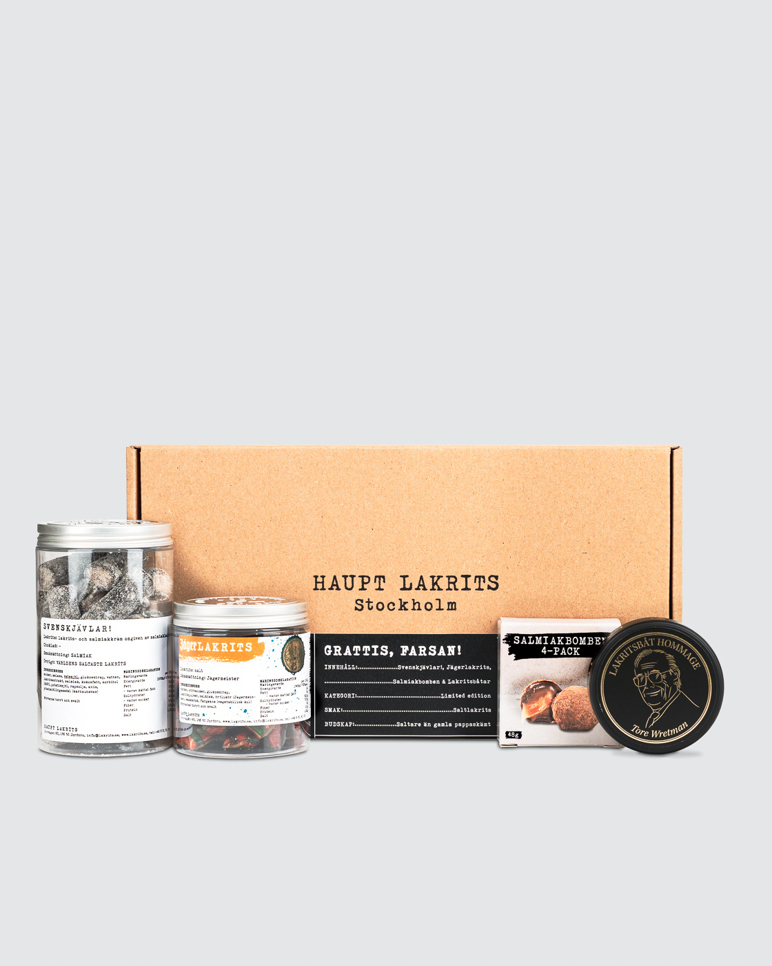 Innehåller Svenskjävlar!, Jägerlakrits, Salmiakbomben 4-pack och Lakritsbåtar 'Hommage' Tore Wretman